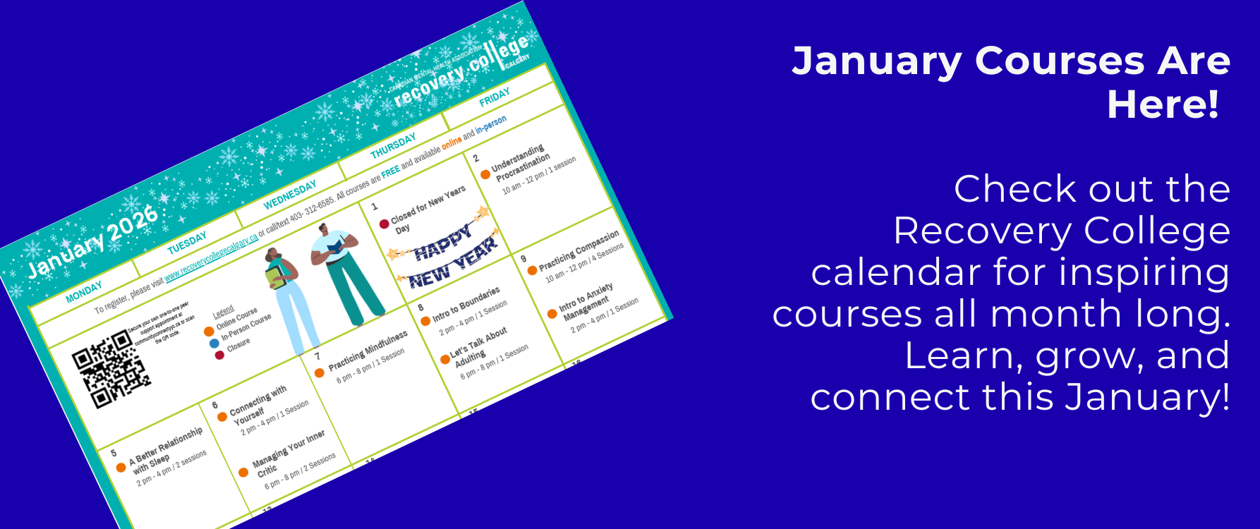 Course CalendarIf you require any help registering for courses please call us at 403-297-1402 or email us at recovery.college@cmha.calgary.ab.ca.